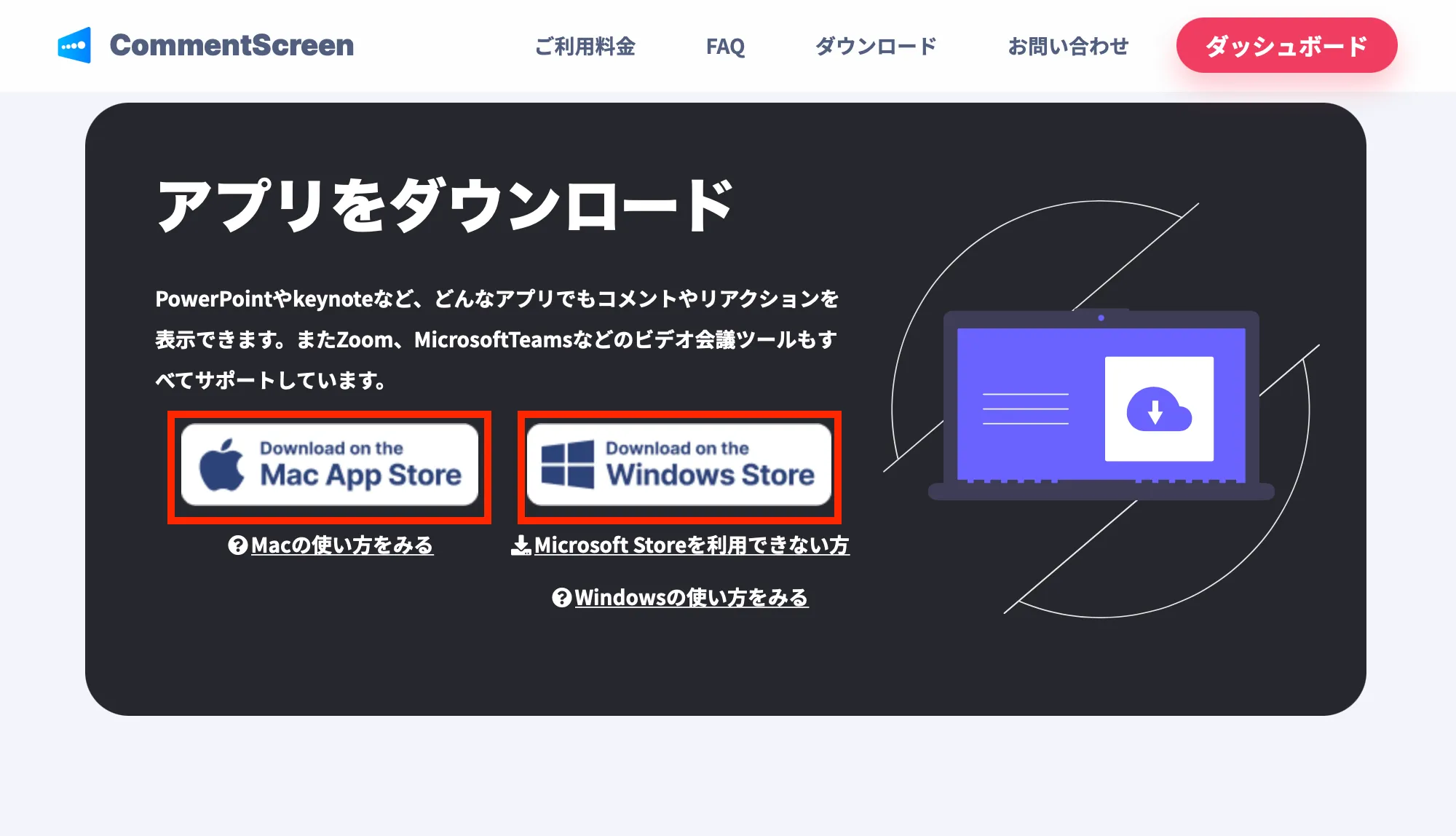 CommentScreenのダウンロードページに行き,Mac,もしくはWindowsのダウンロードボタンを押し,画面に表示される指示通りにダウンロードを行います.