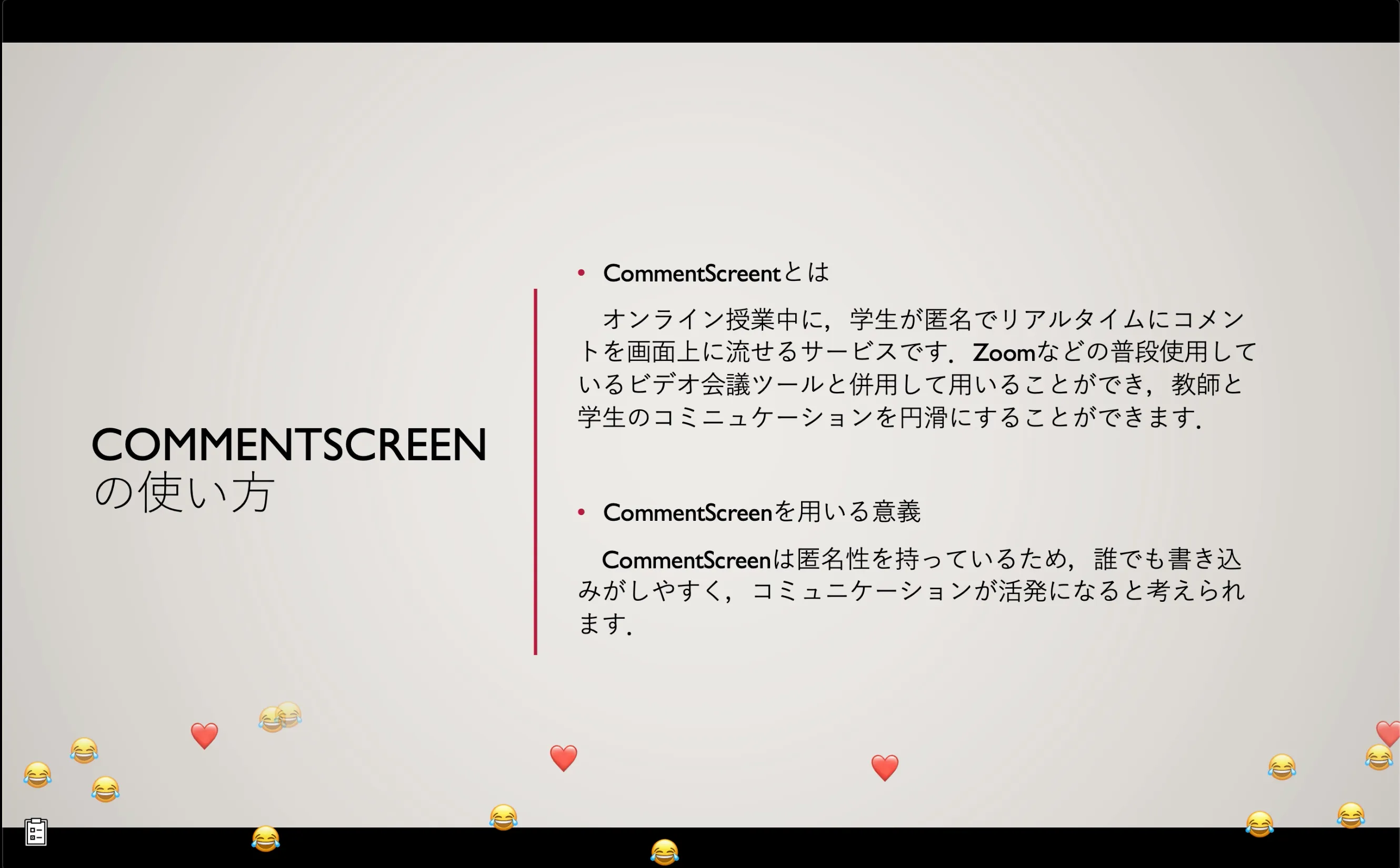 CommentScreenは,Slidoとは違い,画面共有している画面上にコメントが流れるため,他人のコメントやスタンプを見る際に画面を遷移させたり視線を大きく移動させたりする必要がないという特徴があります.また,デザインが動画のコメントに似ており,学生が楽しく授業に参加できます.