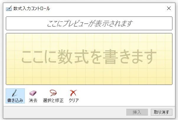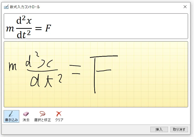 このように,文字や記号を一つ一つ選択する手間をかけずに,数式を記入することができます.また,上の画像のようにマウスで書いたような非常に読みにくい文字でも読み取ることが可能です.しかしながら,一部の特殊文字や連立した式の出力はできないことが欠点です.