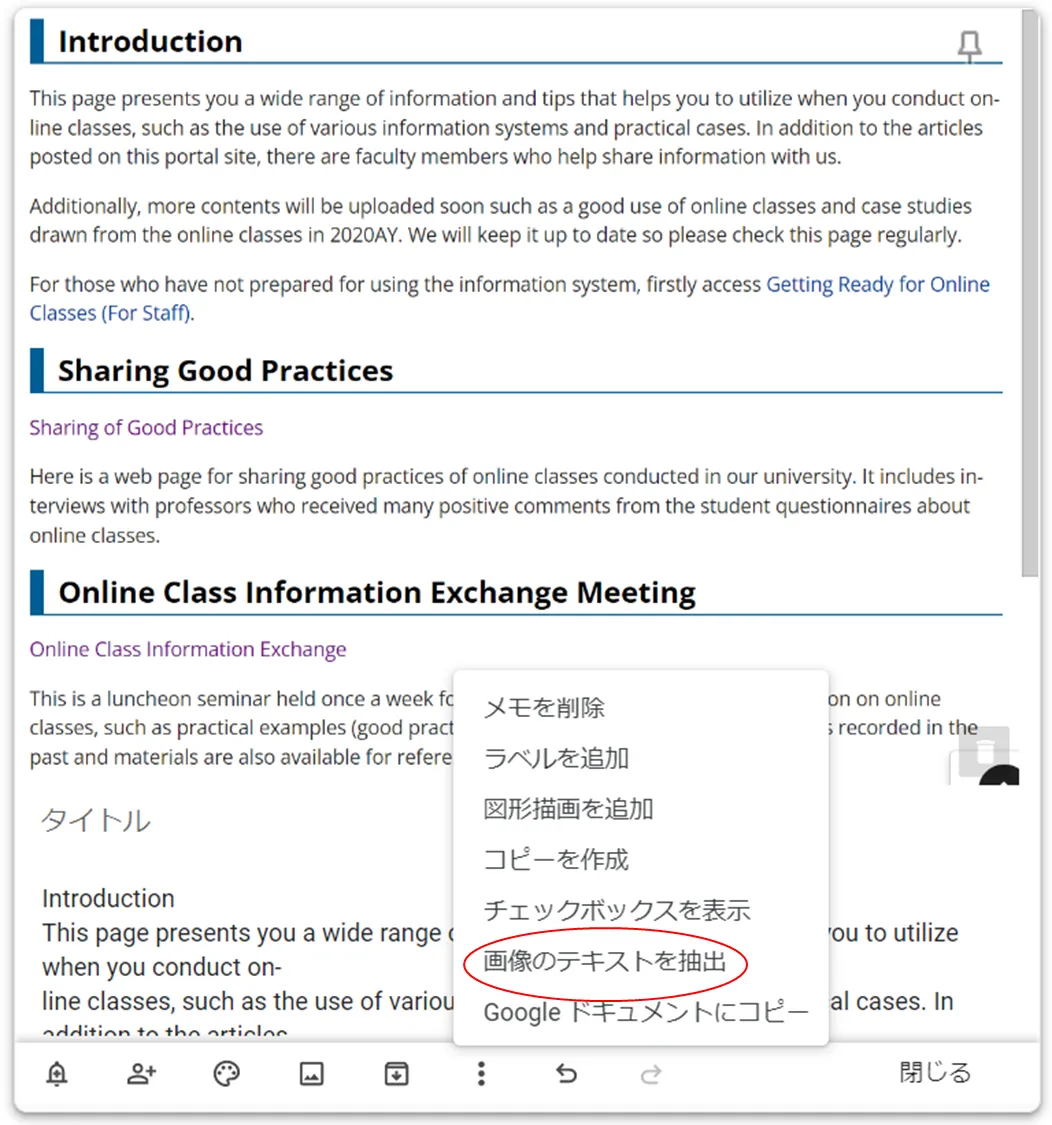 「画像のテキストを抽出」をクリックすると,上図のように,画像内に書かれている文字が画像の上から順に表示されていきます.(画像を読み込んでからテキストの抽出ができる状態になるまでに少し時間がかかります.また,テキストの一部が読み込まれない場合もあります.) 抽出したテキストは編集が可能なので,分からなかった文や単語を調べる際にコピーすることで,手打ちで打ち込むより時間が短縮できます.