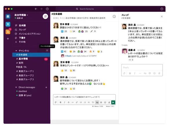 授業の内容に関する質問などは他の学生も閲覧可能な「チャンネル」でやり取りをすると,教員の個別対応の負担を下げるだけでなく,そこからディスカッションが生まれるなどインタラクティブな学びを深めることが可能です(成績や課題提出などの学生個人に関わる内容に関してはDMを用いたやり取りが推奨されます).