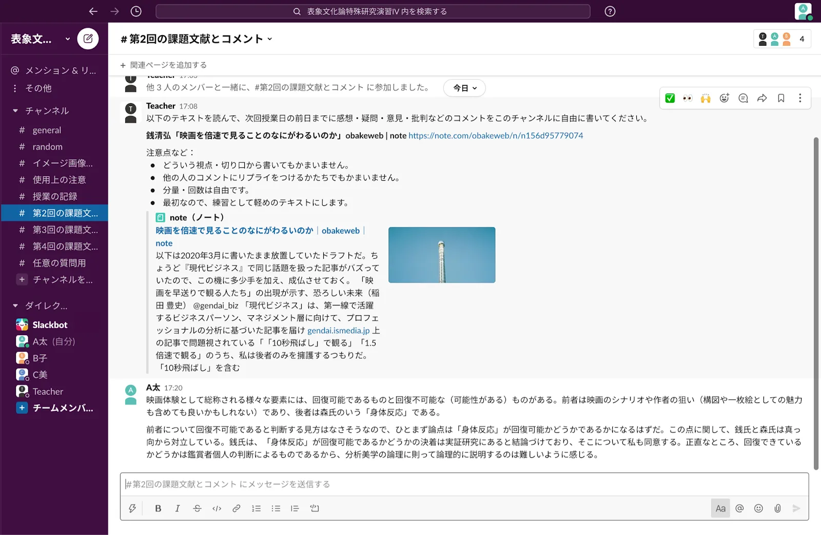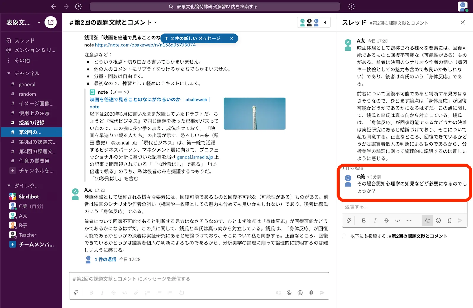 課題文献を授業の1週間前に提示し,授業前までにその文献に対するコメントをSlackの専用チャンネルに書き込んでもらいます.