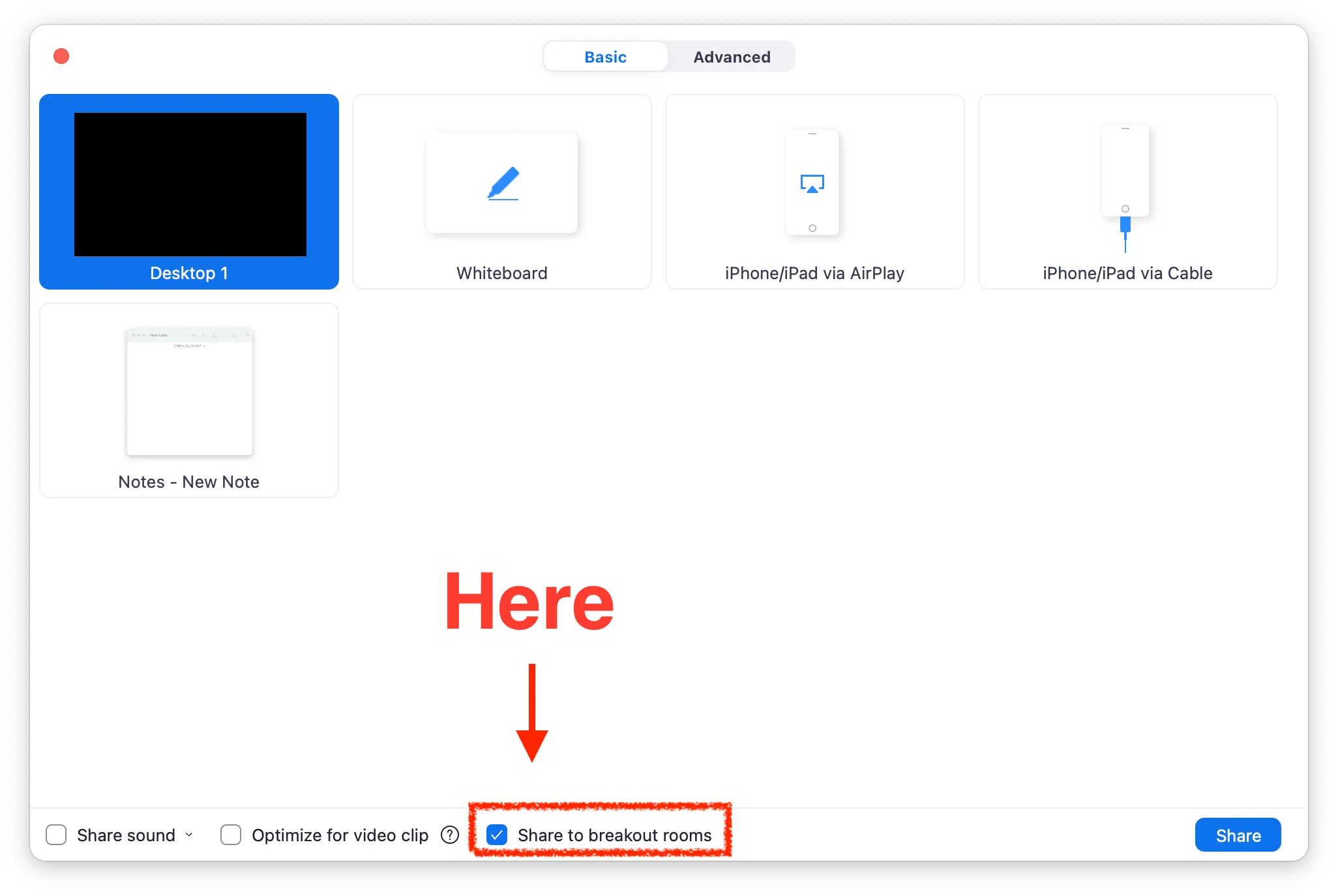 However, note that if you enable screen sharing from the main room while someone is sharing their screen in the breakout room, the screen sharing in the breakout room will be disabled. Also, if you enable screen sharing in the main room, participants in the breakout room will not be able to share screens. (Remember to stop screen sharing from the main room when it is no longer necessary to do so.)