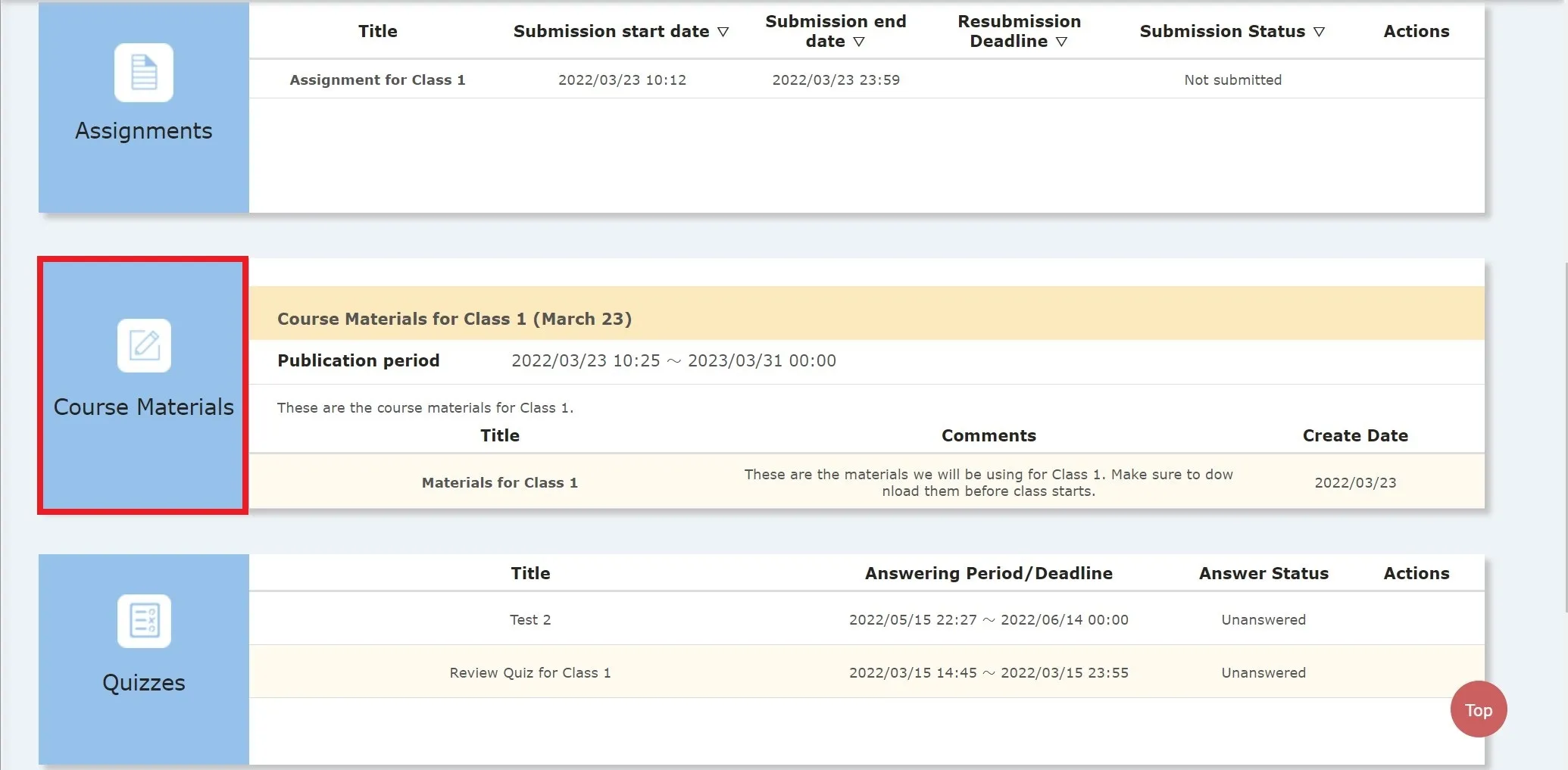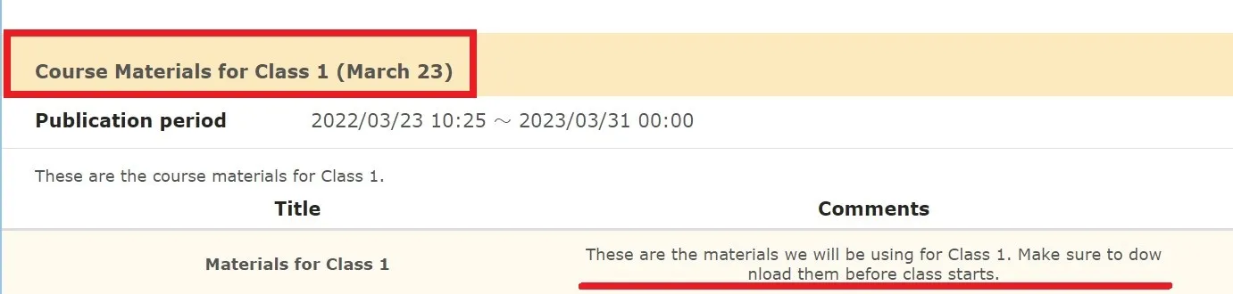 The most important thing to keep in mind here is how to title the material. In addition to the date, it is also helpful to indicate which session the material is from and to include keywords used in the class to make it easier for students to find the material. Also, if you want students to download the material before class, you can make a note in the comments so that the class can run more smoothly.