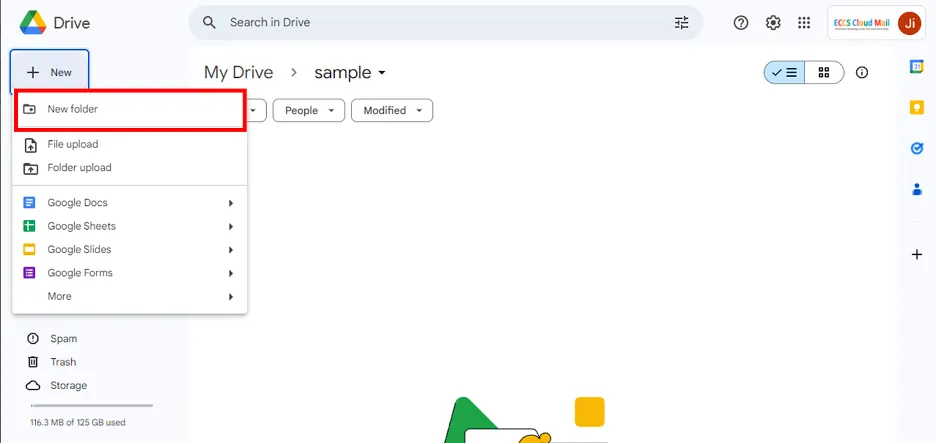 To proceed with the following steps, make sure you are already logged into ECCS Cloud Mail and have Google Drive open in your browser. If you have not completed these two steps, please refer to “Open Google Drive in the browser” on the Google Drive page (an English translation is planned).