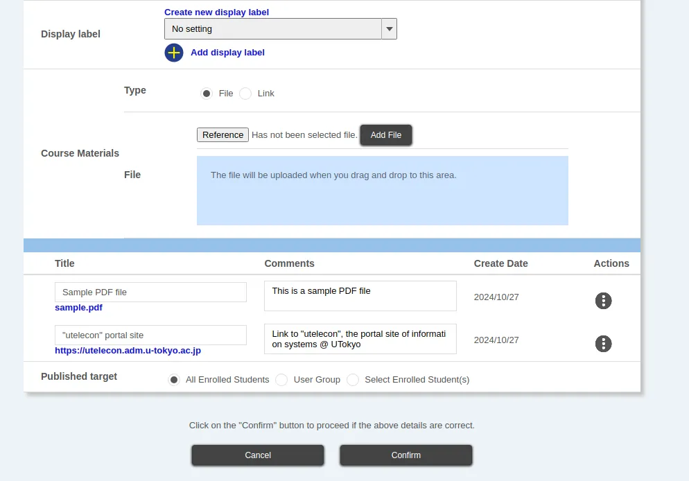There are two types of teaching materials in the “Course Materials”, “Files” and “Links”. “Files” are files uploaded directly to UTOL, while “Links” are links to external sites.