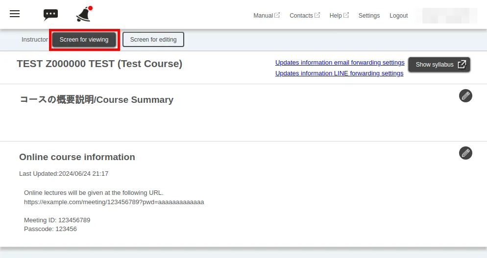 Open the course top screen and click the “Screen for viewing” button at the top of the screen.