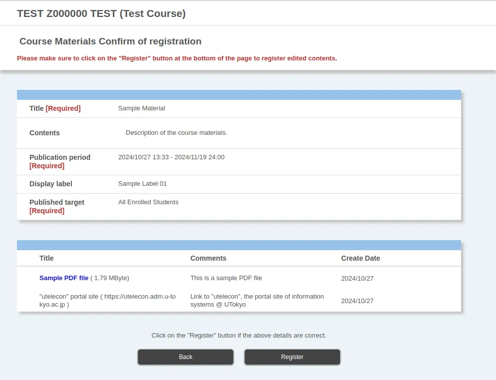 The “Course Materials Confirm of registration” page will open, so please check the details and click the “Register” button.
