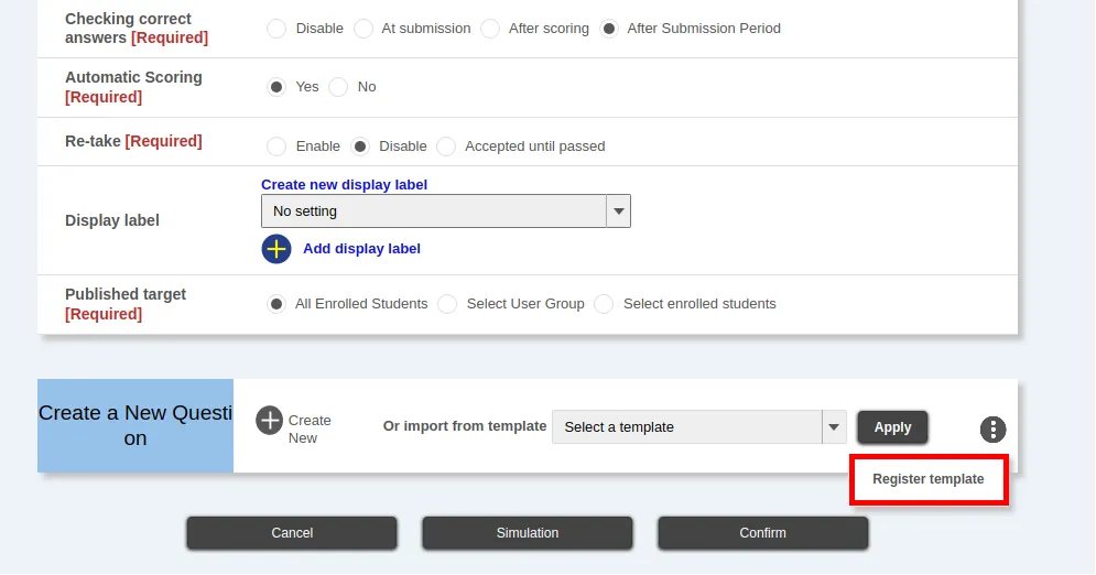 After you have finished setting up the entire test and creating the questions, click on “Confirm” at the bottom of the “Create a New Quiz” screen to check the contents, and then click on “Register” to register for the test.