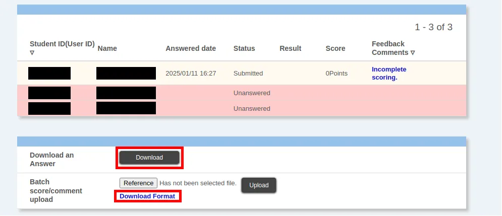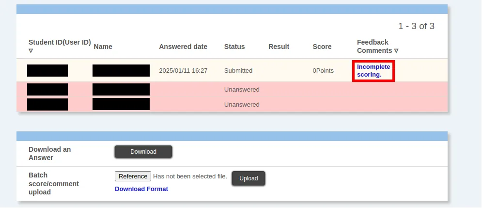 If the file is uploaded successfully, the scores and feedback comments in the Excel file for scoring will be loaded, and the status column for the scored students in the “Answer Status” screen will change to “Marked” or “Entered by the instructor”.