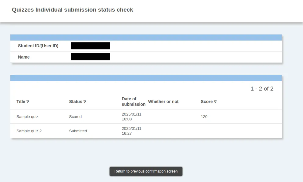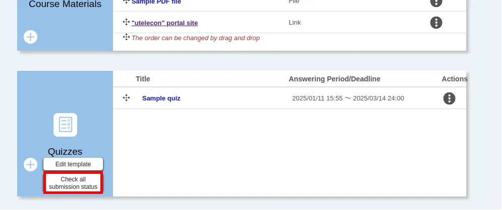 This function allows you to check the submission status of tests in the course as one unit for scoring purposes. To check the submission status of all tests, click on “Check all submission status” in the “Quizzes” section of the “Course Top” screen.