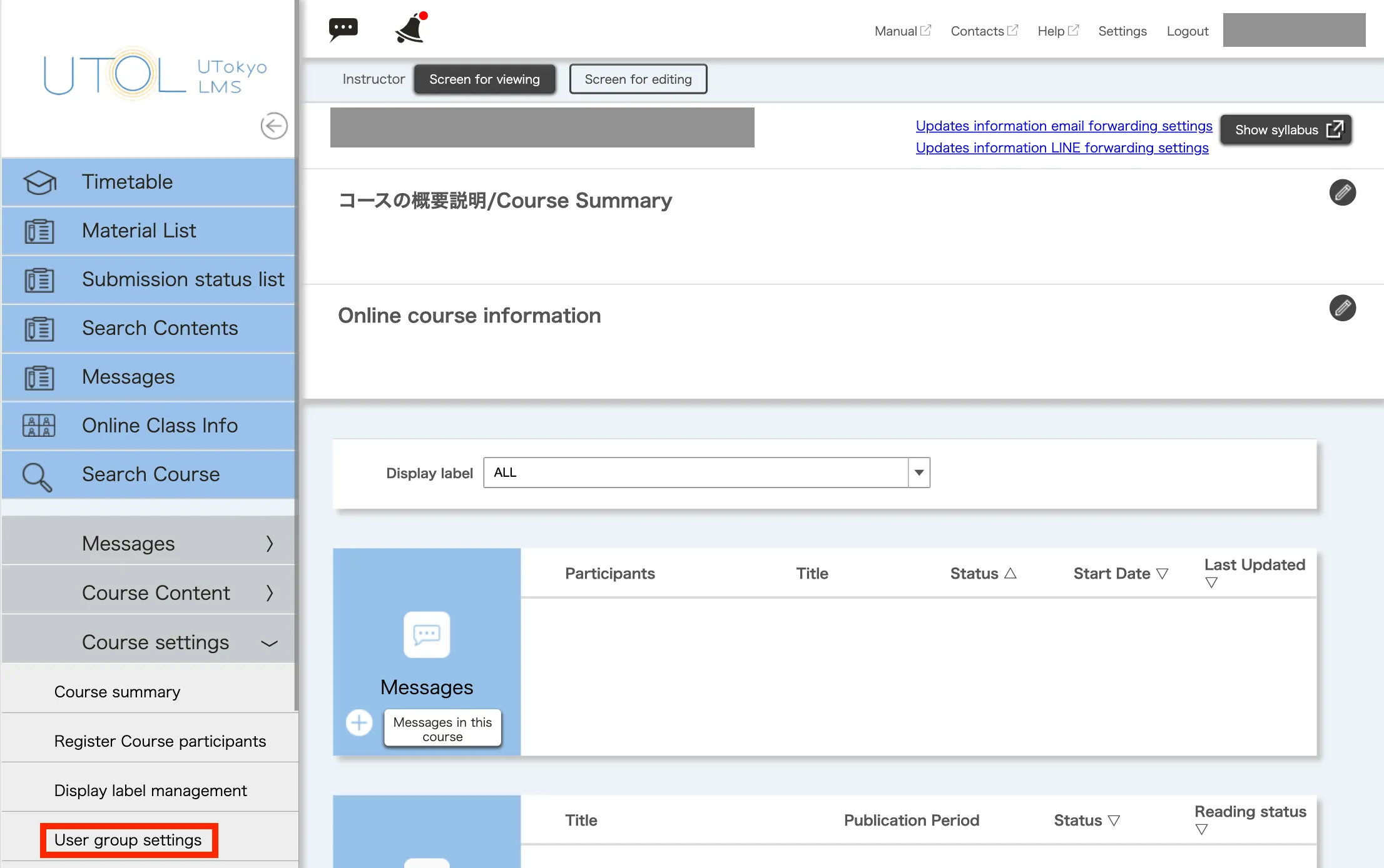 In the courses on UTOL, you can create units called “user groups” from among the students taking the course. These are used to make course contents (such as course materials and assignments) available only to certain students, allowing you to choose to make the contents available only to certain user groups.
