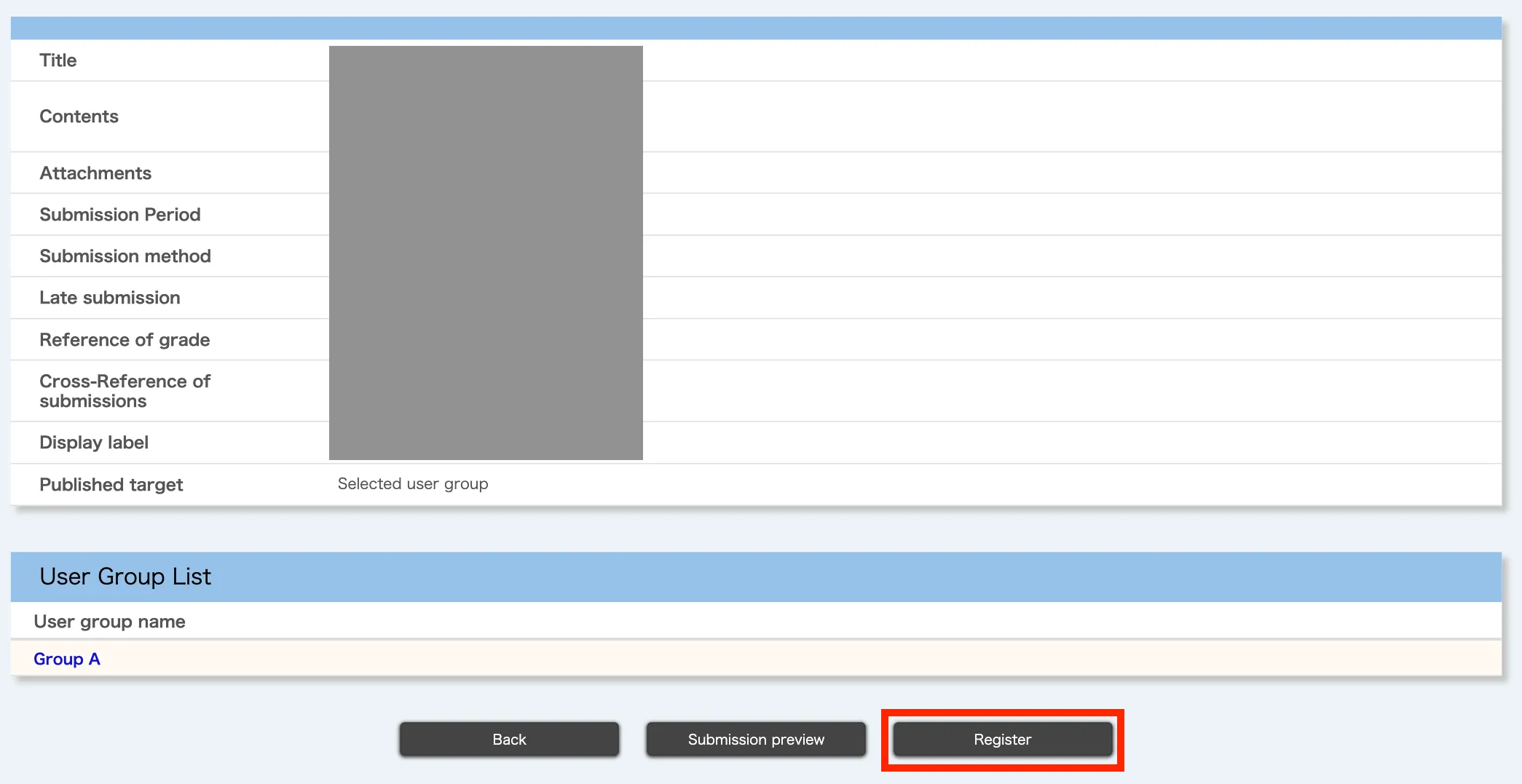 - The new registration/edit assignment screen will appear. After entering and editing the other items, select the “Selected user group” in the “Published target” as shown below.