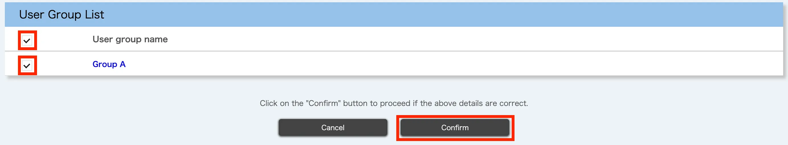- From the “User Group List”, select all the checkboxes for the user groups of published targets. When finished, click the “Confirm” button. (Selecting the checkbox directly below the “User Group List” will allow you to select all the displayed user groups simultaneously.)