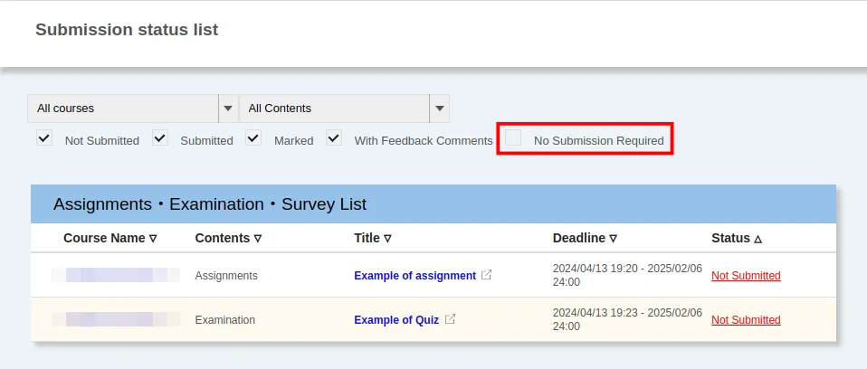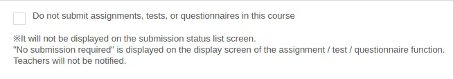The function for No Submission Required prevents assignments, quizzes or surveys that do not need to be submitted from being displayed on the “Submission status list”.