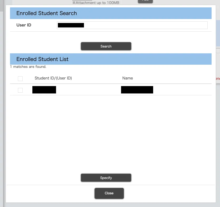 - Enter the user ID for an enrollee (if the user is logged in with their UTokyo Account, enter their 10-digit common ID) in the “User ID” field and click “Search”. The user will be displayed in the search result list.