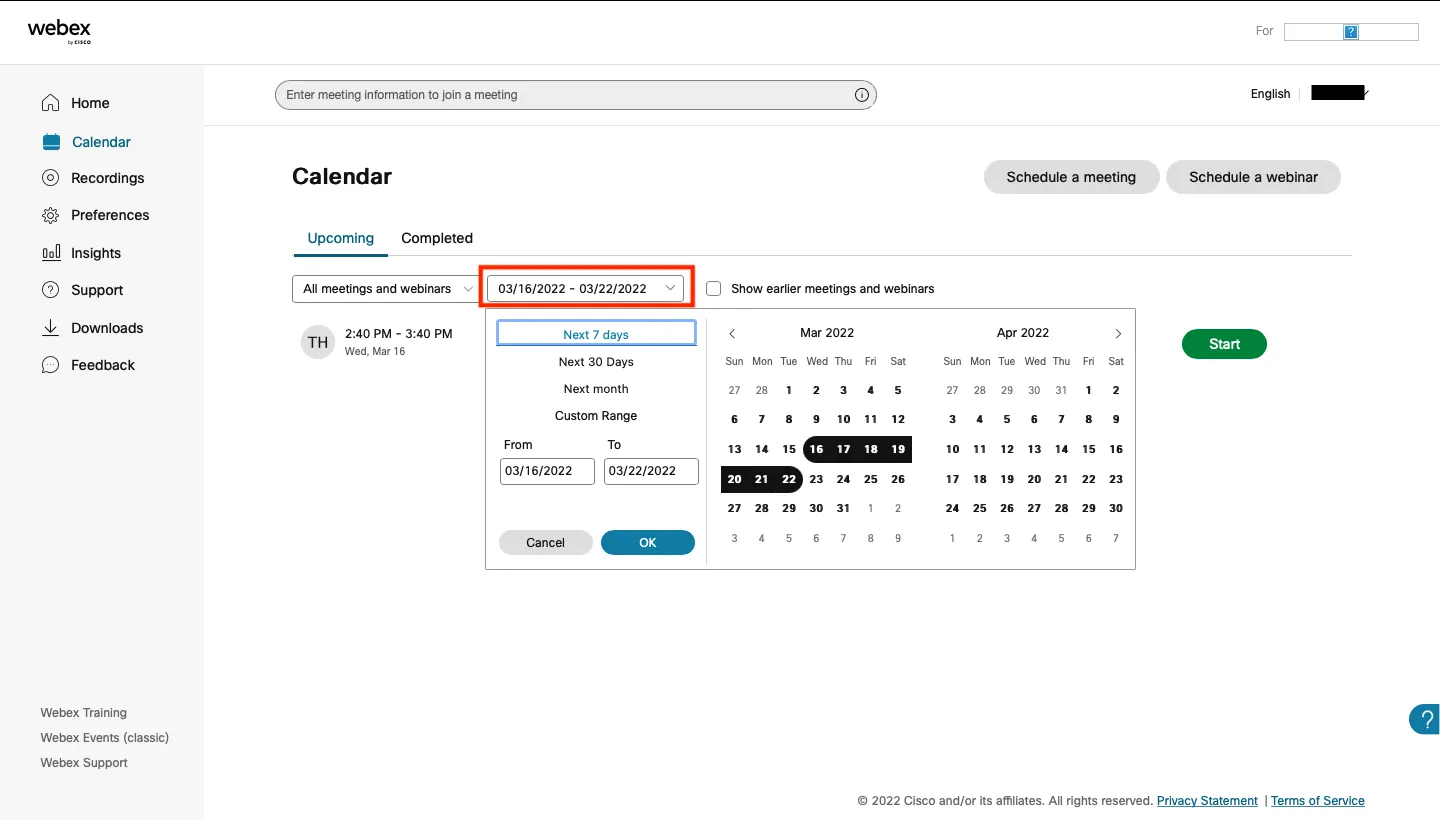 To schedule a Webex Webinar, click “Schedule a webinar” on the home screen to configure the settings.