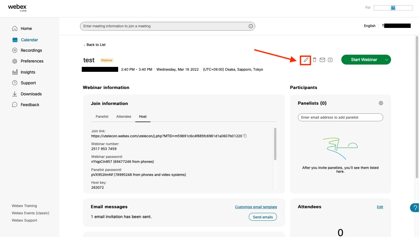 To edit the contents of a webinar that has already been set up, select the webinar in question from the home screen and click on the Edit icon.