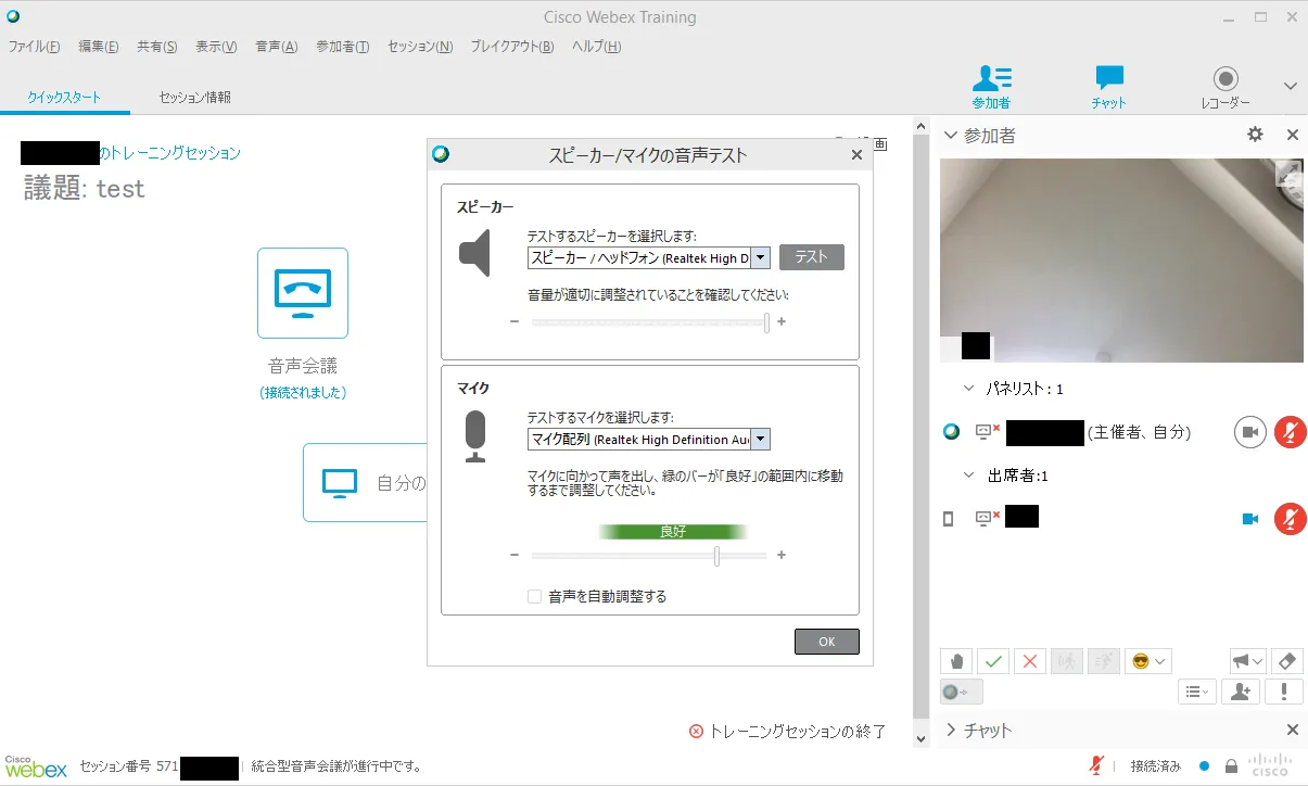 - Entering the training session, the screen shows “Test your speaker/ microphone”. Choose the speaker and mirophone that you want to use. Click OK button and test your speaker and microphone.