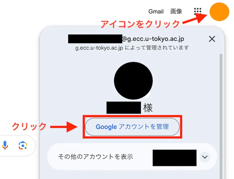 - 右上のアイコンをクリックしてメニューを開き,「Googleアカウントを管理」をクリックしてください.