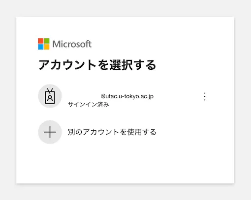 - 表示されているアカウント名を選択し,画面の指示に従ってサインインを行ってください.状況により,安田講堂の画像があるサインイン画面が表示される場合や,多要素認証(MFA)の本人確認のみが要求される場合などがあります.サインイン手順の詳細は「UTokyo Accountで情報システムにサインインする」を参照してください.