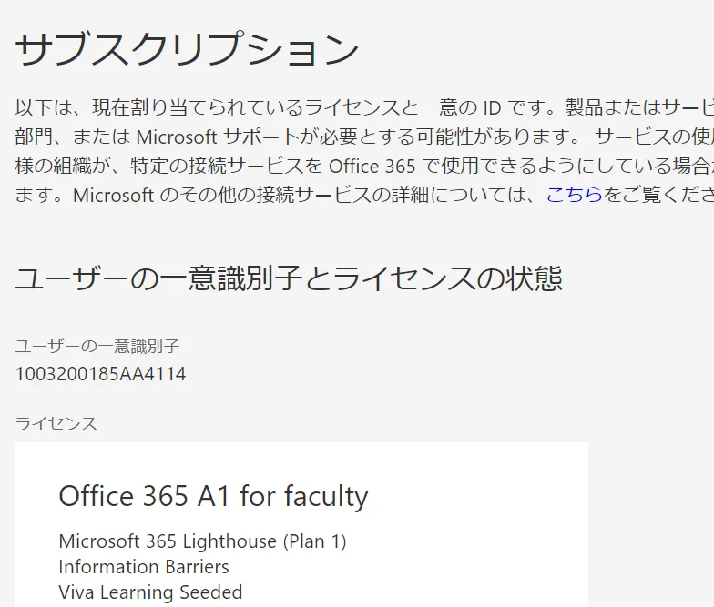 - マイアカウント画面の画面左のメニューから「サブスクリプション」を押下します.「Office 365 A1 for faculty」が表示されて,かつ「Microsoft 365 A3…」の表記が無い場合は,2024年2月1日のストレージ制限の対象となる「学生でも教職員でもないUTokyo Account保持者」です.