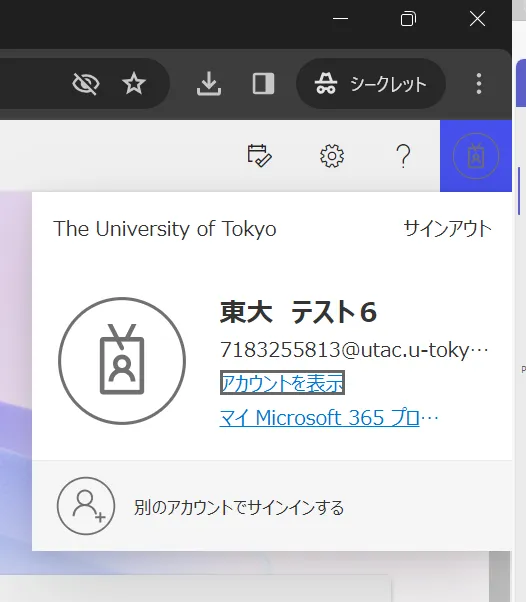 - サインイン画面ではUTokyo Account(共通ID+@utac.u-tokyo.ac.jp)を入力します.ログイン後,画面右上のアカウントのボタンを押下し,「アカウントを表示」を押下します.