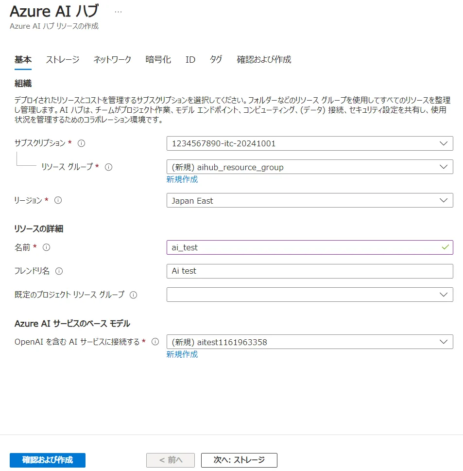 aihub_resource_groupというリソースグループ名で作成し,以下に作成される各リソースをまとめます.まとめられたリソースは,権限の継承や削除などを一括で対応することが可能となります. - リージョン:AIハブをどの地域(リージョン)にあるデータセンターにデプロイするかを指定します.使いたい機能が特定の国のリージョンにしかない場合は,その国のリージョンを選択ください.パブリッククラウド上での情報管理に不安がある場合は日本国内(
