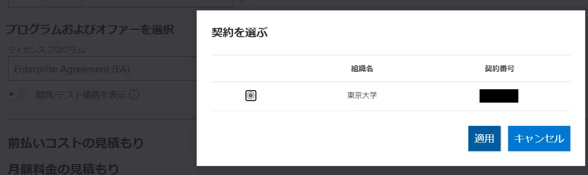 プログラムおよびオファーを選択で,Enterprise Agreementを選択してください. - 東京大学の Agreement かどうかの確認が表示されるので,