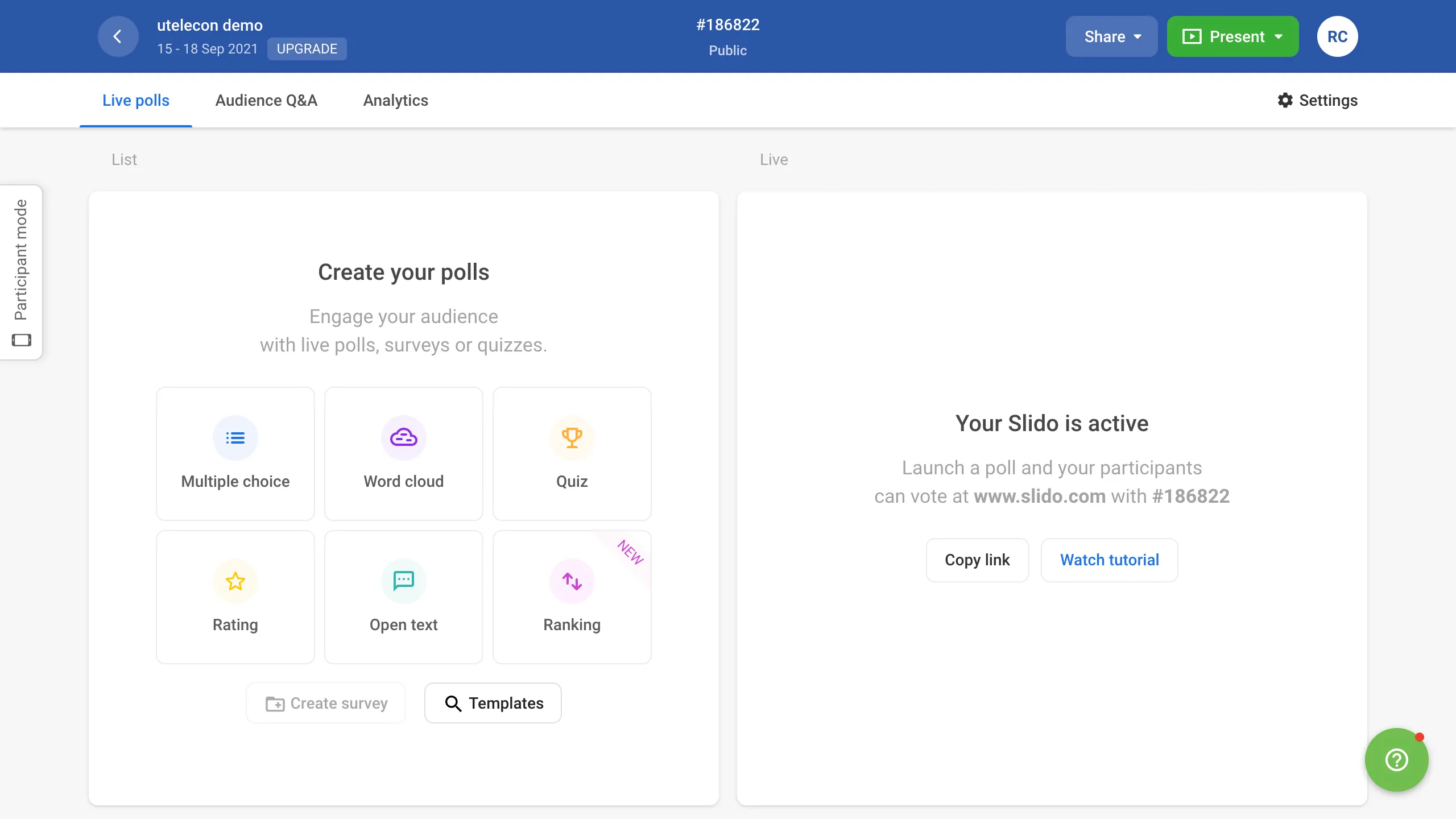 - 「Create Slido」あるいは「Schedule Slido」をクリックすると,イベントが作成されます.イベント画面右上の「Share」ボタンをクリックすると,イベントに参加するための専用ページのURLがクリップボードにコピーされるので,このURLを参加者に共有してください.参加者はURLにアクセスすることで,イベントに参加できます.