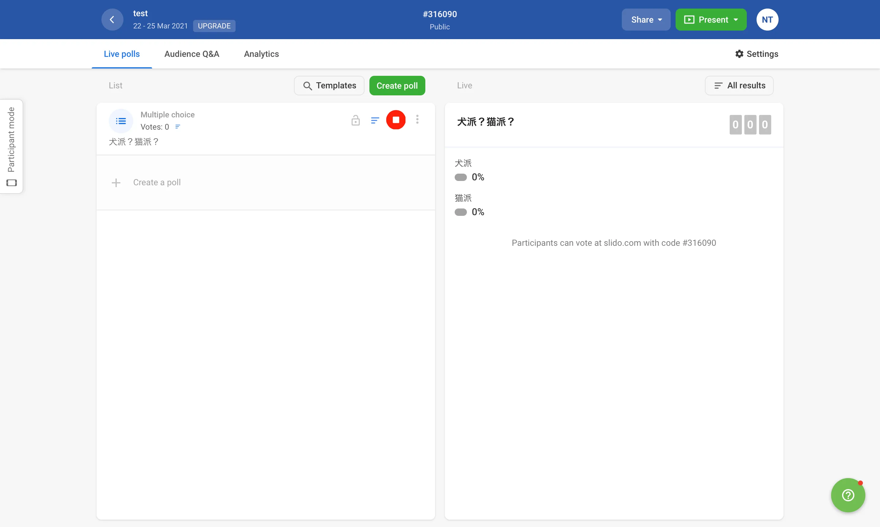 Slidoでは,投票(polls)機能を使うことで,教員から学生に対して質問やクイズを行うことができます. 画面左上の「Live polls」を選択してください.
