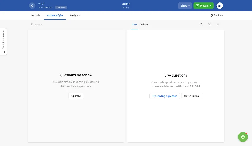 このページでは,Slidoの主催者側画面において,主催者ができることを説明しています.主催者側画面には,イベントの一覧ページからアクセスしてください.