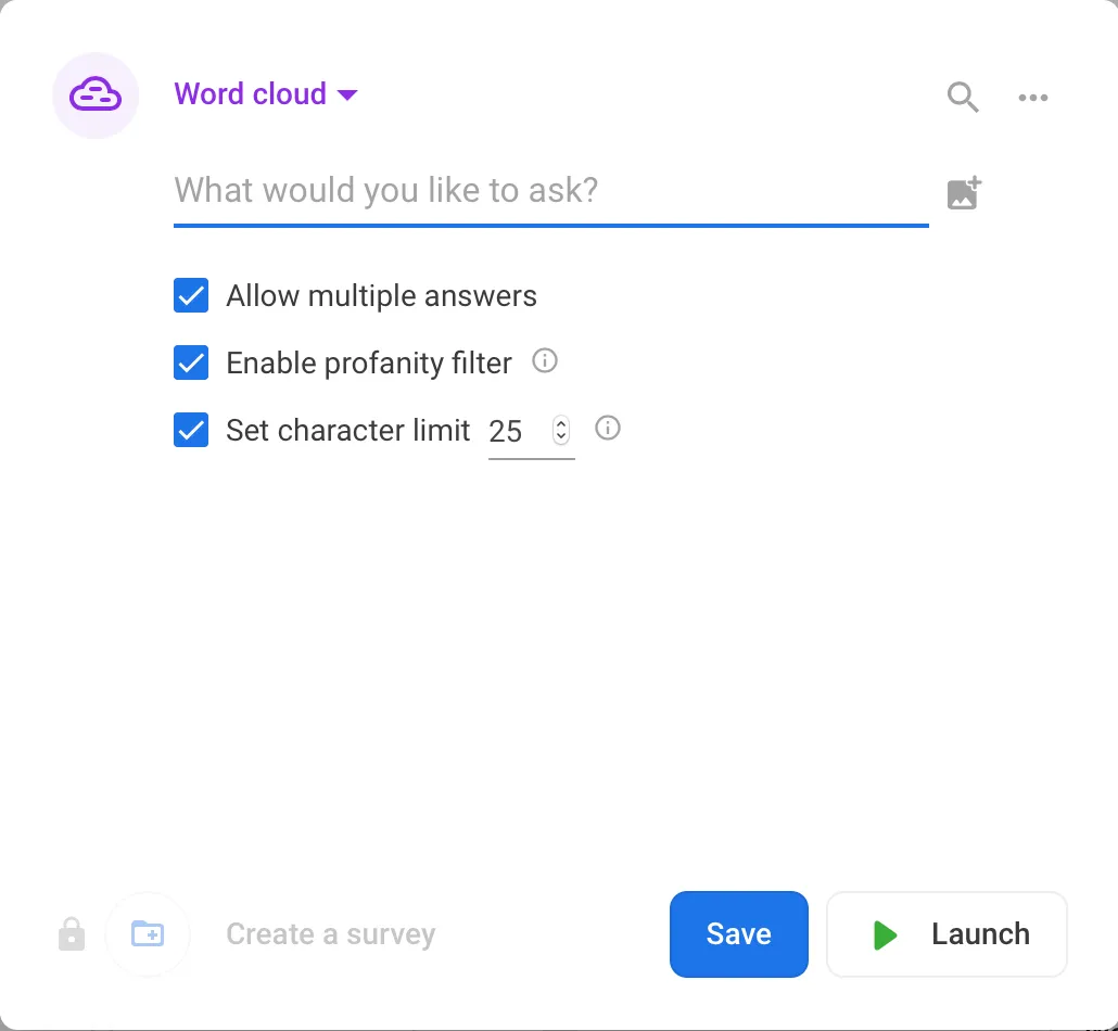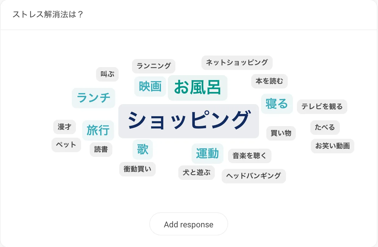 - Word cloudー参加者の回答が「cloud」として可視化される質問を設定する(参加者はOpen textと同様に短文形式で答える)