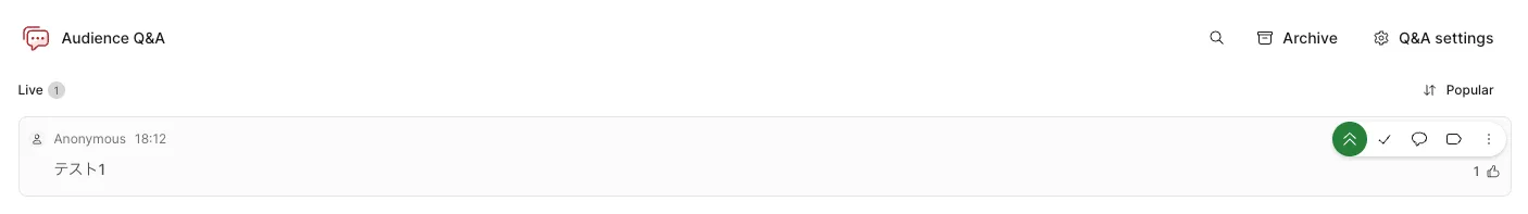 - Mark as answered(チェックマーク):このボタンを選択することで,質問・感想を回答済みとしてアーカイブできます.アーカイブした質問は学生から見えなくなりますが,教員側からは常に確認できます.