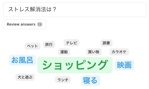 - 回答が図のように表示されます.同一の回答が複数あった場合,その単語が大きく表示されます.(学生側の表示)