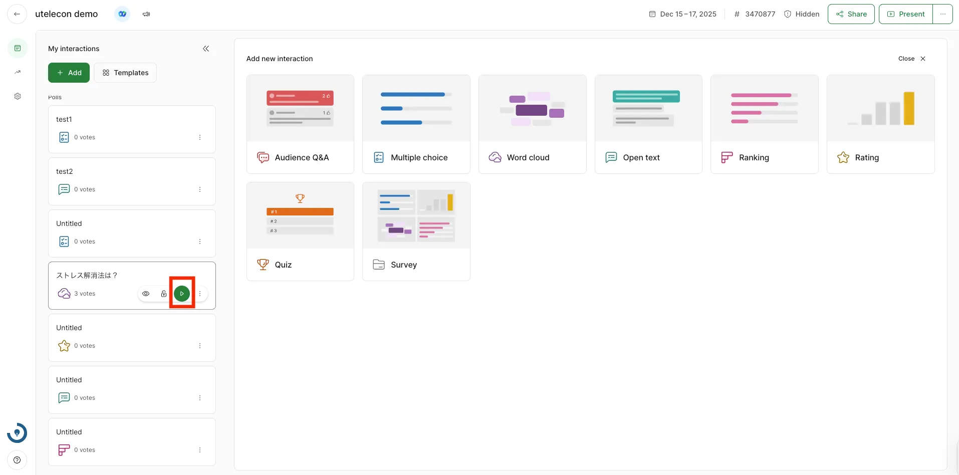 投票を作成するには,画面左上の「+Add (Add new interaction)」を選択してください.