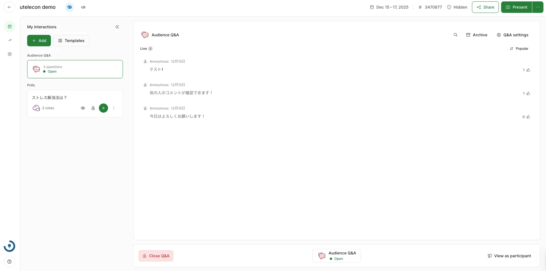 Slidoに参加者として参加する場合の操作方法は「Slidoで参加者ができること」を確認してください.