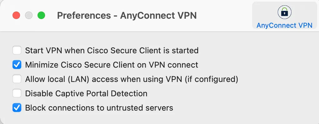 UTokyo VPN接続時は,そのままだとコンピュータの繋がっているローカルネットワークへの通信もVPNを経由します.VPNに接続したままローカルネットワークに設置されたプリンタ等を利用したい場合は,Secure Clientのウィンドウの左下,歯車のボタンをクリックしてください.すると下記のようなウィンドウが出てきます.このウィンドウ(Windowsの場合はウィンドウの「環境設定」タブ)から,「VPN使用時にローカル(LAN)アクセスを許可する(構成されている場合)」にチェックをつけてください.