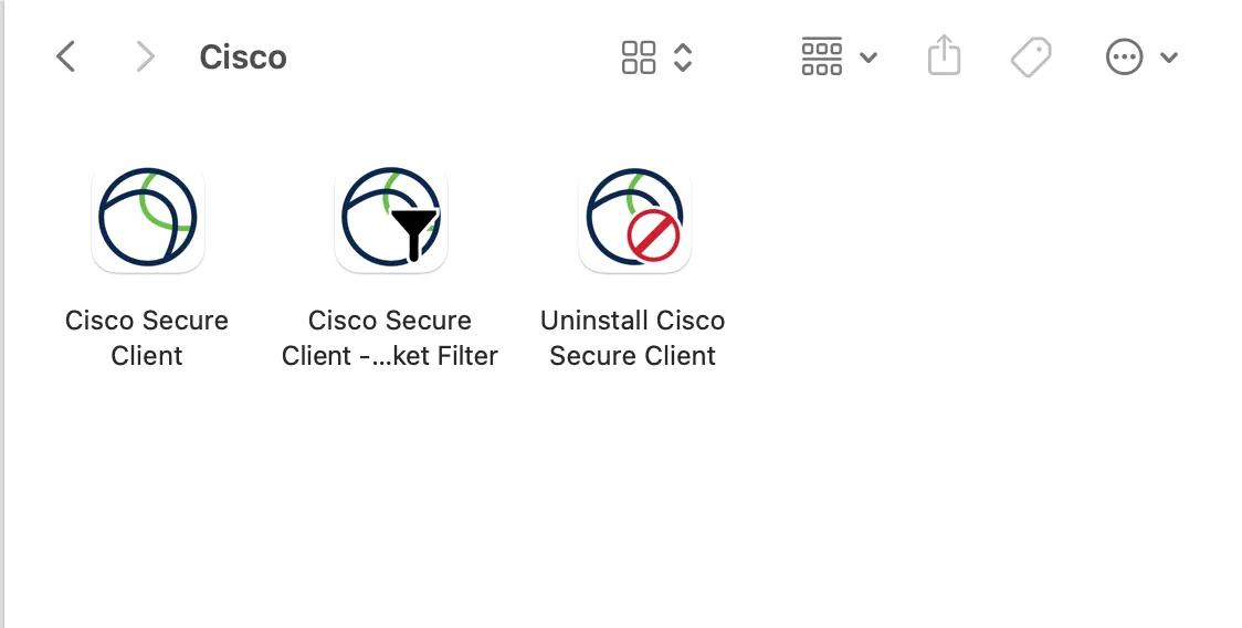 手順D: インストールが完了すると,アプリケーションフォルダに「Cisco」というフォルダが作成され,その中にVPNのクライアントアプリケーションであるCisco Secure Clientがインストールされています.