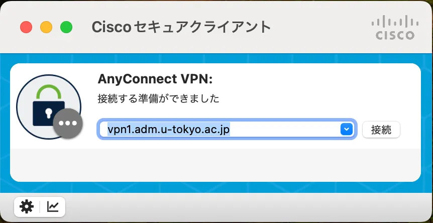 手順E: 準備編でインストールしたCisco Secure Clientを起動すると,以下のような画面が出てきます.VPN接続先として vpn1.adm.u-tokyo.ac.jp と入力し,「接続」ボタンをクリックします.