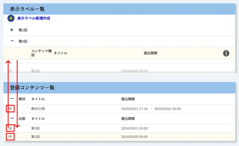 - ラベルとの紐づけを解除したい場合は,「表示ラベル一覧」から「登録コンテンツ一覧」へ移動させてください.