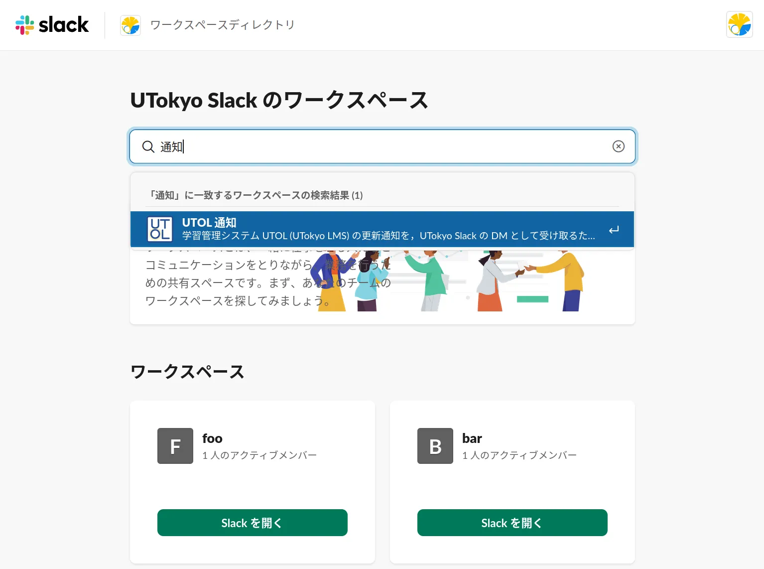 | UTokyo Slack | ◯ | × | 「UTOL 通知」(Slack App)とのダイレクトメッセージ |