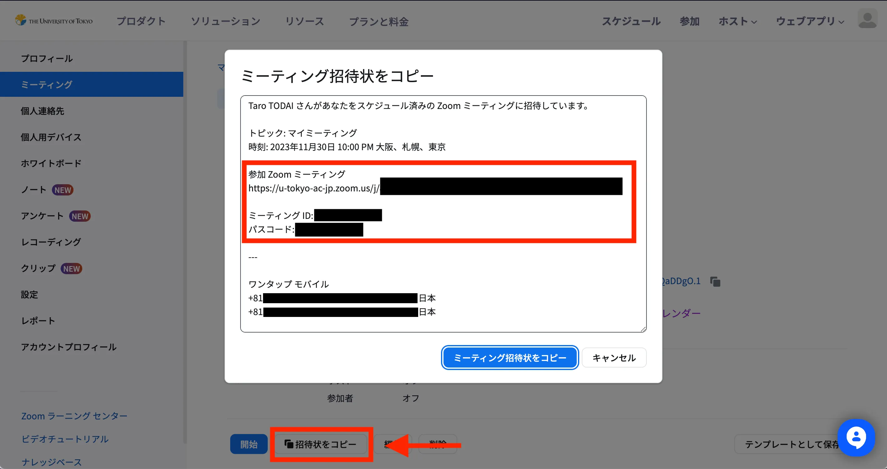 - 手順5の画面に表示されている「招待状をコピー」のボタンを選択して表示される画面の内容を参加者に知らせてください.特に,招待リンク,ミーティングID,パスコードの3つだけ抜き出して知らせておくと簡単で便利です.