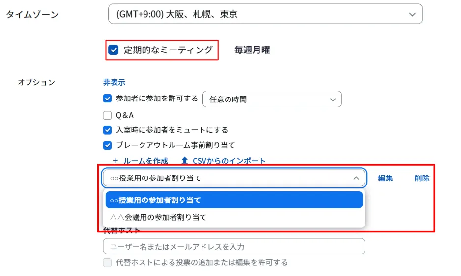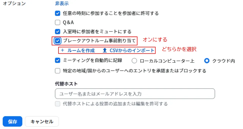 - 「スケジューリング時に参加者をブレイクアウトルームに割り当てる」:「事前に設定した割り当てを読み込む」を参照