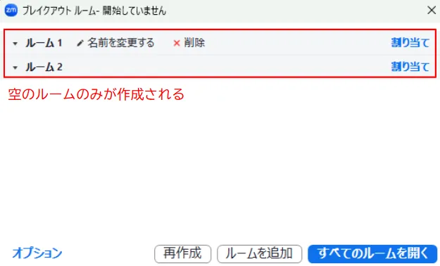 - 空のルームを追加する場合:ウィンドウ下部の「ルームを追加」を押してください.作成されたルームには,手動で参加者を割り当てる必要があります.