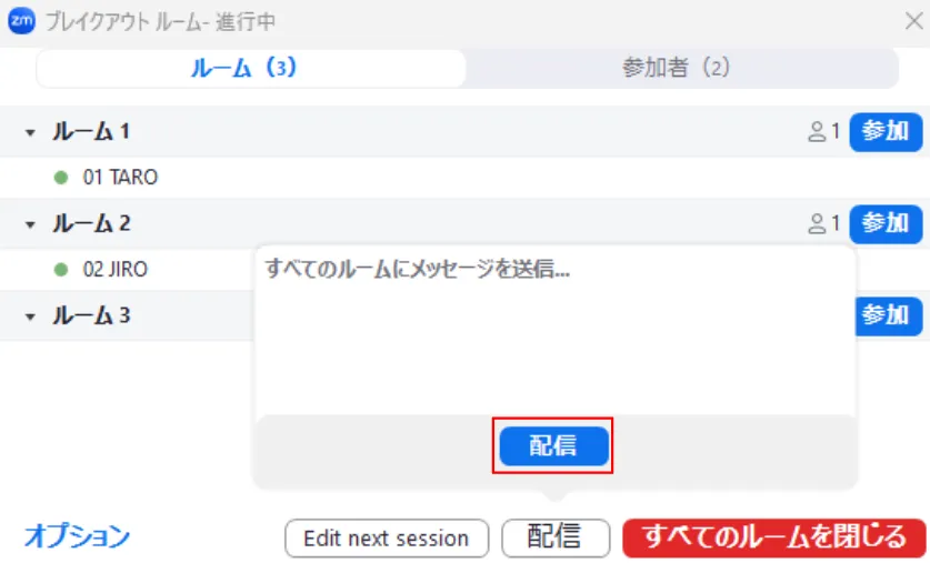- 「すべてのルームを開く」を押すと,ブレイクアウトセッションが開始されます.
