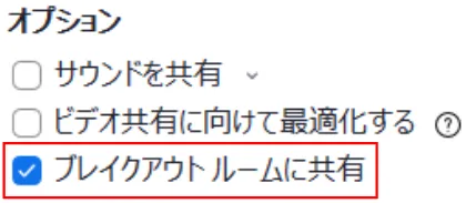 - ウィンドウの「オプション」欄にある「ブレイクアウトルームに共有」をオンにしてください.端末の音声も共有する場合は,「サウンドを共有」もオンにしてください.