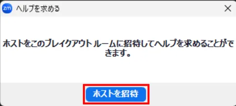- 下図のようなウィンドウが出てくるので,「ホストを招待」を押してください.すると,ホストに送信元のブレイクアウトルームに参加するように通知が届きます.