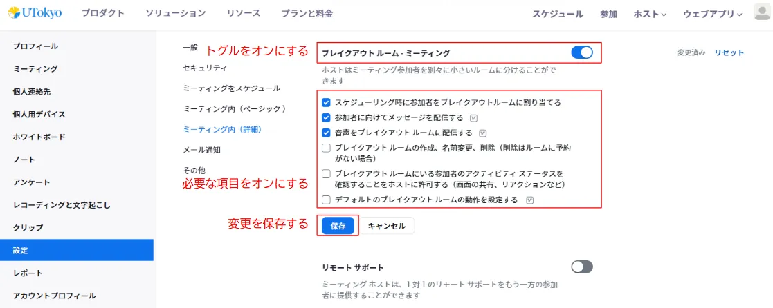 - ブレイクアウトルームに関連する機能について,必要な項目をオンにしてください.