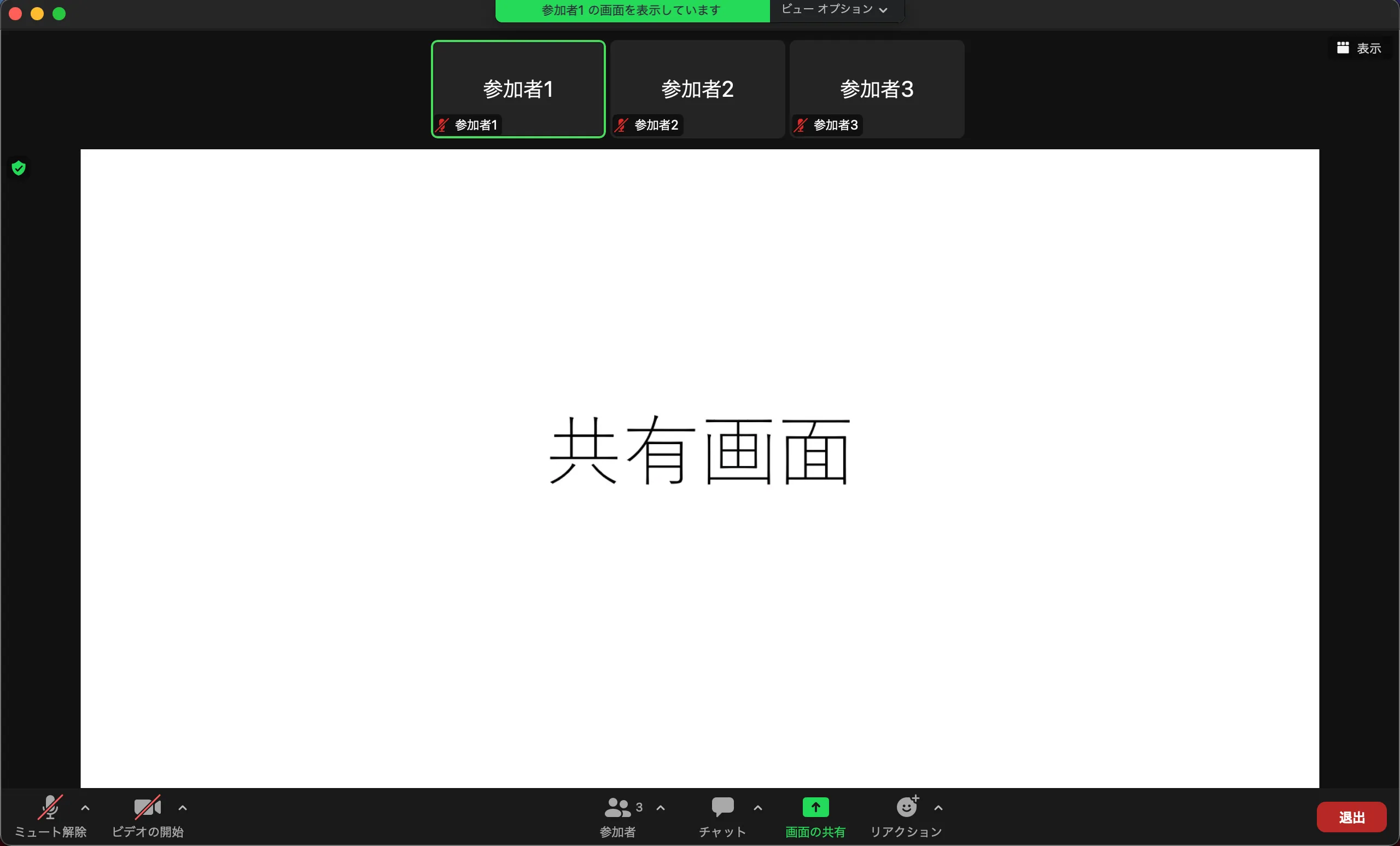 画面共有が行われている場合には,デフォルトでは共有画面が全画面表示されます.また,全画面表示を解除すると,共有画面が大きく表示され,参加者のビデオは上に小さく表示されます.しかし,場合によっては共有画面よりも参加者のビデオを大きく表示したい場合があります.その場合,左右表示という機能を使用すると便利です.